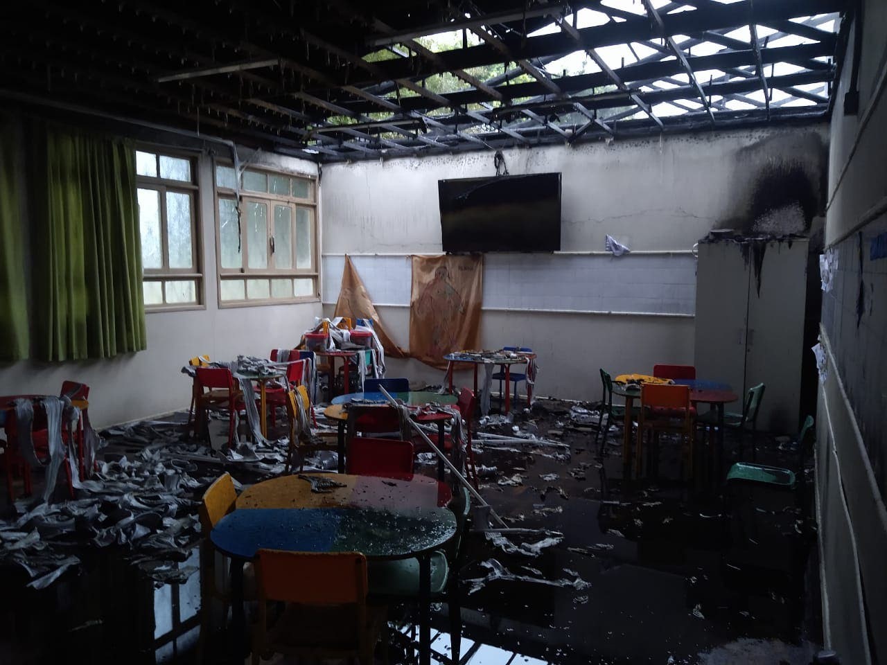 Um vizinho percebeu que durante a madrugada o alarme da escola disparou. Ele acionou a Polícia Militar, que em seguida, constatou fogo em seis salas.