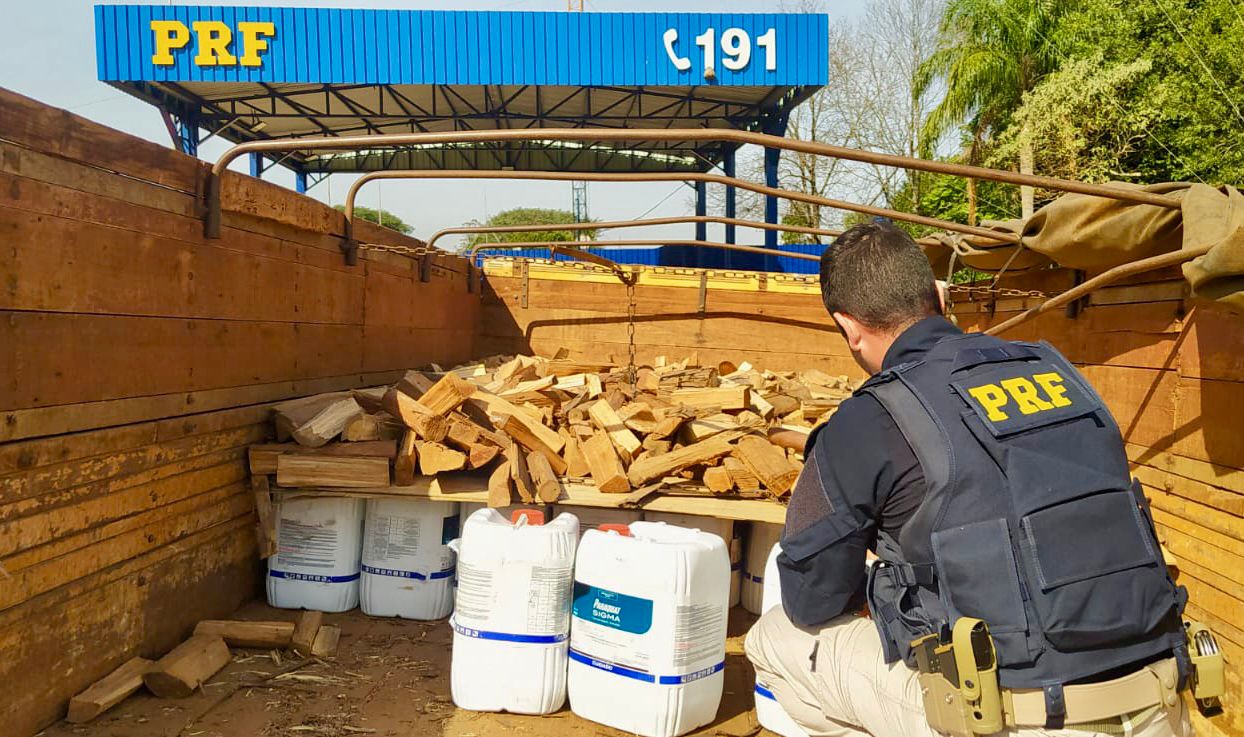 Ao verificarem a carga, os PRFs encontraram 100 galões de agrotóxicos contrabandeados, que estavam escondidos embaixo da lenha. O produto é proibido no Brasil e causa riscos à saúde humana e ao meio ambiente.