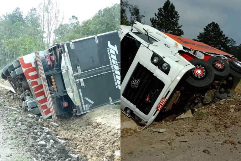 Uma carreta, carregada com carne, tombou por volta das 15h desta quarta-feira (27), na BR-470, Serra da Santa, em Pouso Redondo.