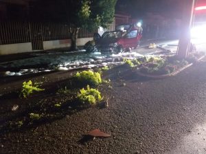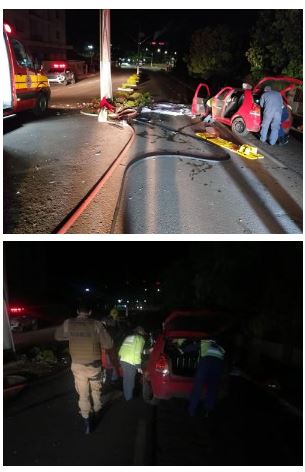 Deslocado ao local foi constado que o veículo placas de Itapiranga havia colidido contra um poste de alta tensão vindo a rodopiar e parar sobre a pista em sentido contrário ao que transitava. Ao chegar no local a guarnição verificou que o condutor de 23 anos estava preso nas ferragens do veiculo.