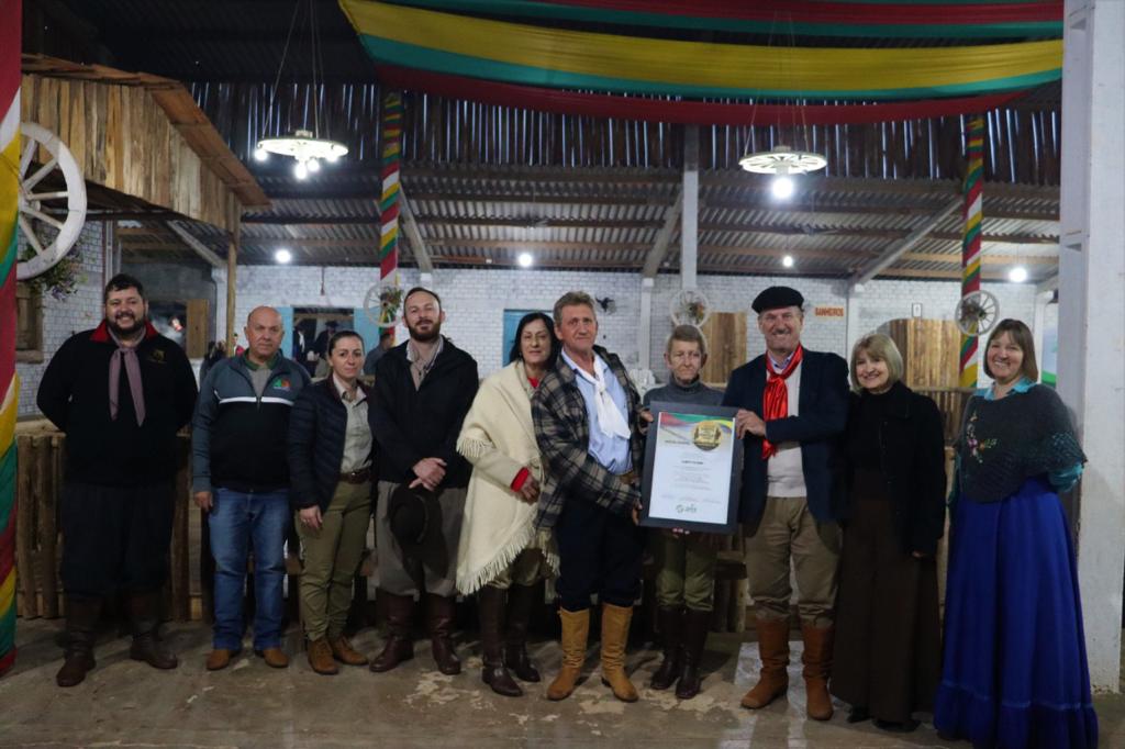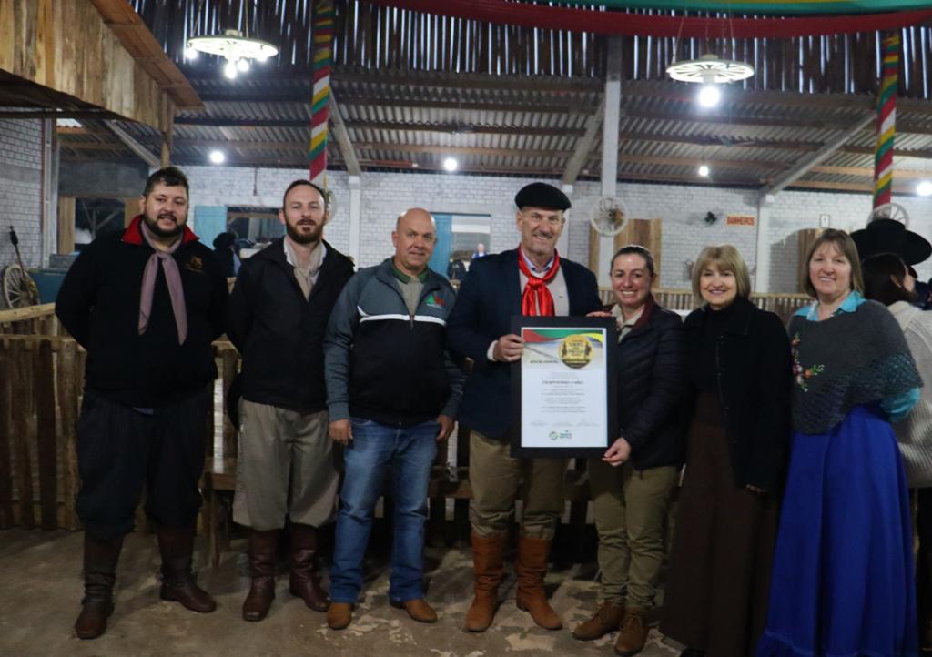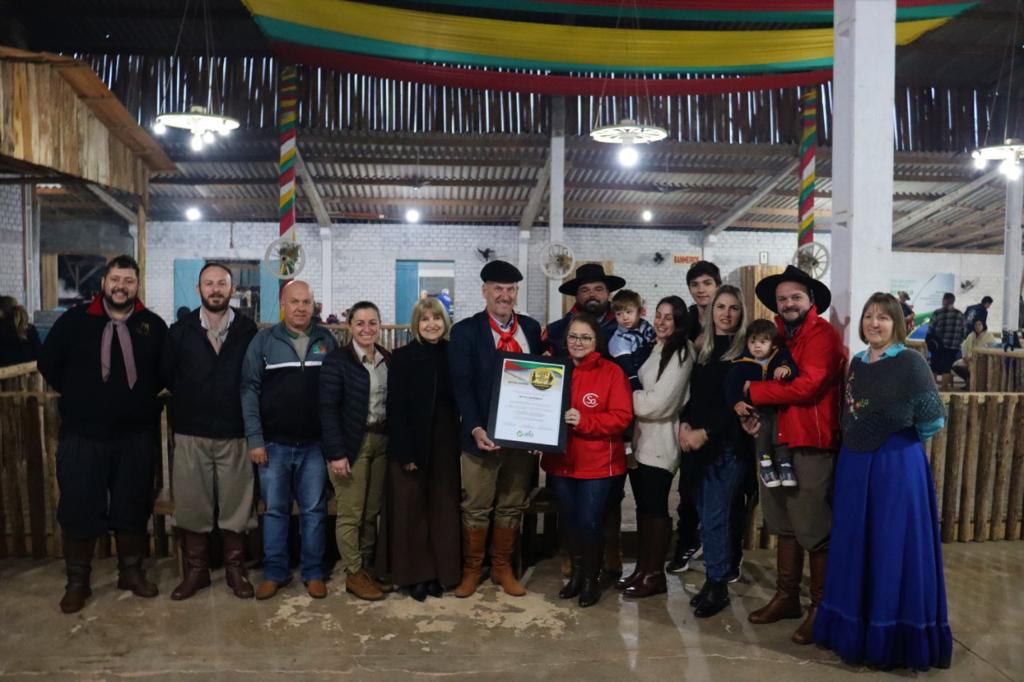 O prefeito Rosemar Sala, participou dos dois momentos, juntamente com outras autoridades e representantes dos CTGs Sentinela da Fronteira e Guardiões da Fronteira, além das demais entidades tradicionalistas da região. No ato ocorrido no sábado, Rubem Krabbe e a família de Milton Sganderla, receberam a comenda que registra a condição de patrono e homenageado, respectivamente, da Cavalgada deste ano.