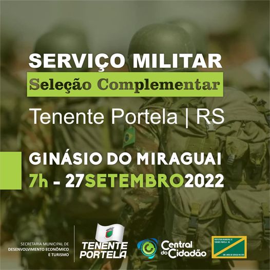 O secretário da Junta de Serviço Militar de Tenente Portela, CONVOCA todos os jovens, DESIGNADOS PARA SELEÇÃO COMPLEMENTAR no 19 GAC e Esquadrão de Comando da 1ª Brigada de Cavalaria Mecanizada de Santiago/RS, pertencentes à classe de 2004 ou alistados no ano de 2022.