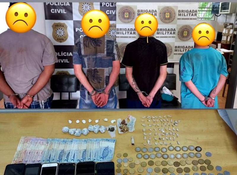 Com os elementos, que têm antecedentes por tráfico e homicídio tentado, os policiais encontraram várias porções, prontas para venda, de cocaína, maconha e crack. Um dos presos mora em Cerro Largo e os outros três são da região metropolitana de Porto Alegre.