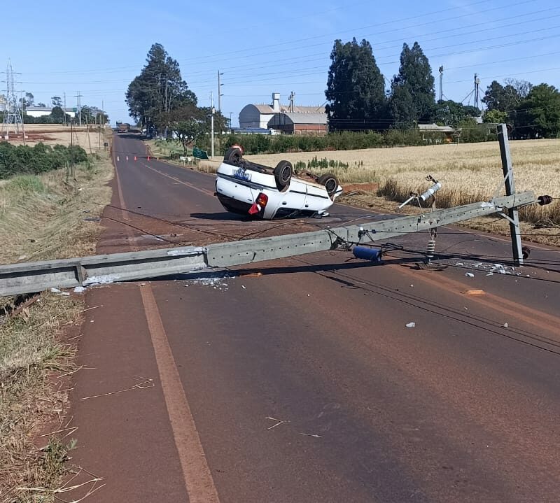 Conforme informações, o motorista de um veículo Palio perdeu o controle, saiu da pista e colidiu em um poste de energia elétrica. Com o impacto o carro capotou e o poste caiu sobre a pista, interrompendo o trânsito no local.