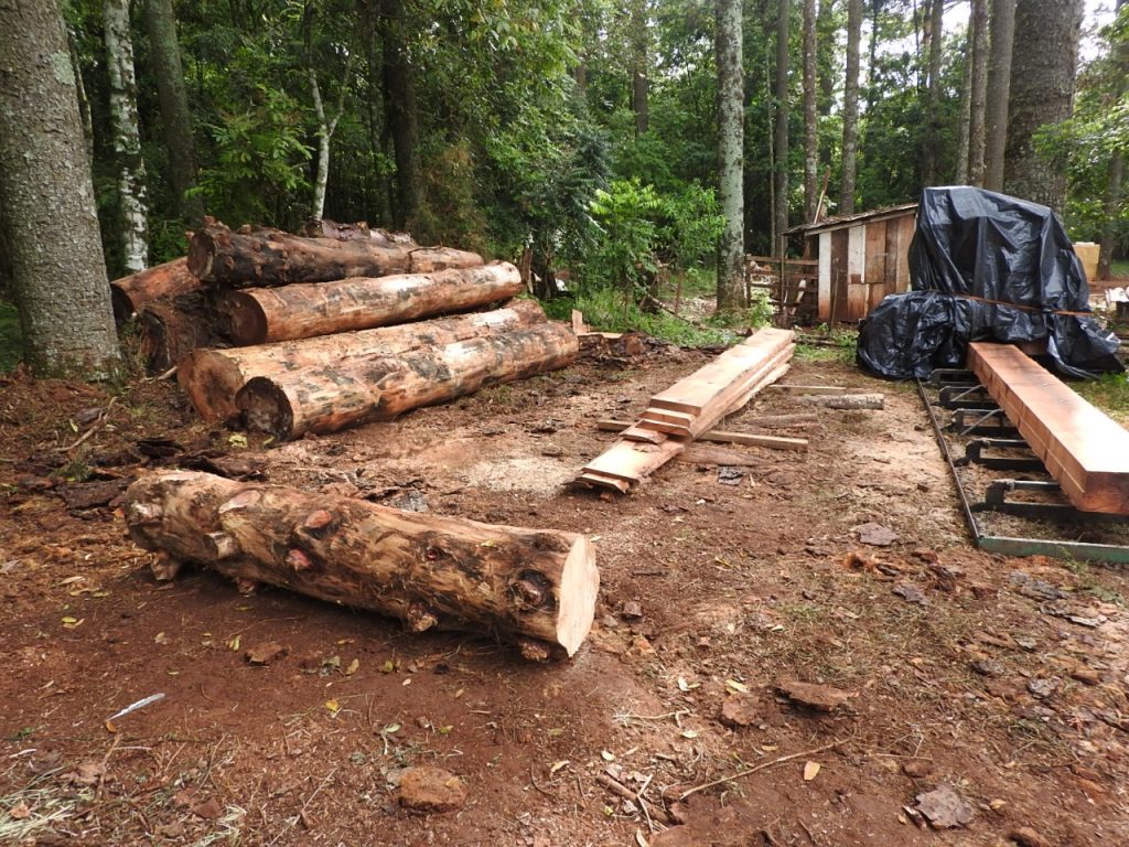 A equipe do 3° BABM deslocou até o local informado e encontrou uma serraria móvel, localizada ao lado de uma área verde. No momento da fiscalização, estava sendo beneficiada madeira nativa, proveniente do corte de três exemplares de pinheiro brasileiro ( _Araucaria angustifolia_ ). O responsável pela serraria móvel não possuía cadastro florestal (junto à SEMA) e apresentou Cadastro Técnico Federal (IBAMA), porém estava vencido.