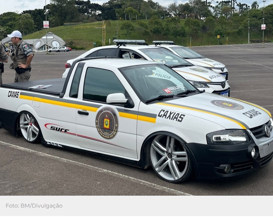 Na manhã deste domingo (13) policiais do 12º Batalhão de Polícia Militar (12º BPM) de Caxias do Sul estiveram no Parque de Eventos da Festa da Uva para verificarem uma denúncia anônima. No local, onde é realizado um evento automotivo, foi flagrada uma VW Saveiro adesivada irregularmente com os símbolos e cores da Brigada Militar.