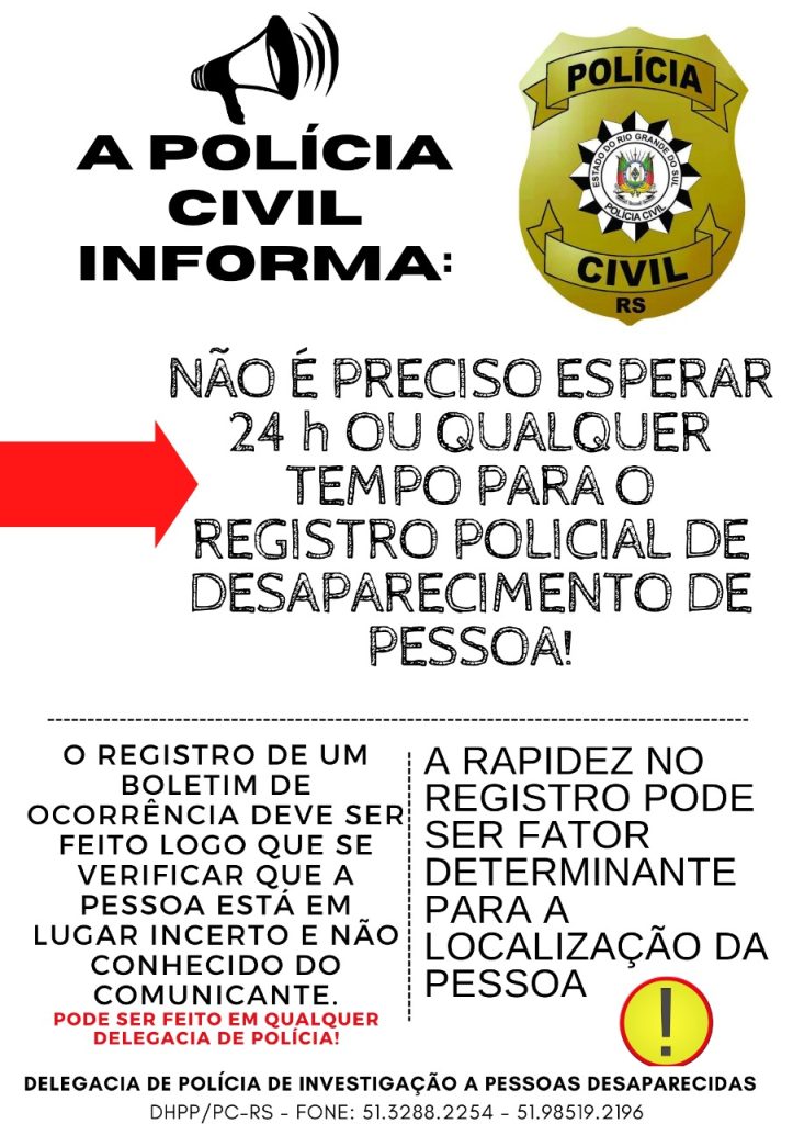 Para comunicar o desaparecimento de alguém não é preciso esperar 24 horas. A orientação é procurar a delegacia de Polícia mais próxima e registrar um boletim de ocorrência assim que a ausência incomum da pessoa for percebida.