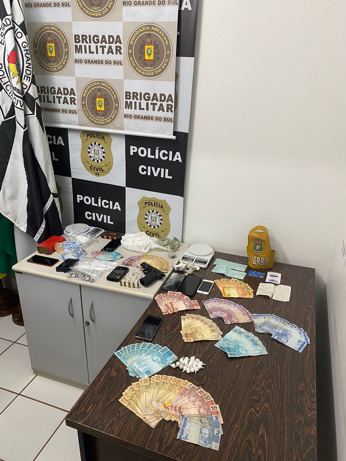 Das buscas resultaram em onze prisões por tráfico e posse de drogas, além da apreensão de três balanças de precisão, R$ 19.384,00 em espécie, R$ 99.600,00 em cheques, onze celulares, uma pistola 9mm marca Bersa, uma Range Rover Evoque, 24g de crack, 476g de cocaína, 476g de maconha e dois carregadores 9mm.Presos foram encaminhados a DP de Santo Augusto para lavratura do flagrante e posteriormente ao Presídio Estadual de Três Passos.