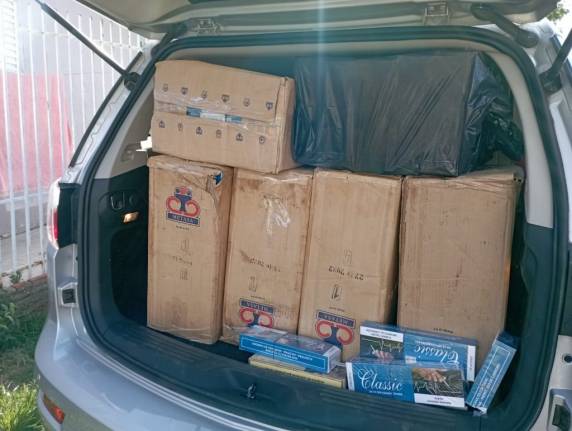 Em diligências de investigação de combate ao crime organizado no bairro Santa Maria nesta tarde, os policiais perceberam movimento estranho em um bar, quando visualizaram um indivíduo saindo do local com um pacote de cigarros. Nesse momento, foi realizada abordagem no local, já visualizando no chão alguns pacotes, e solicitado ao proprietário se havia mais pacotes, este indicou um depósito onde foram localizadas 40 caixas de cigarros contrabandeados do Paraguai.