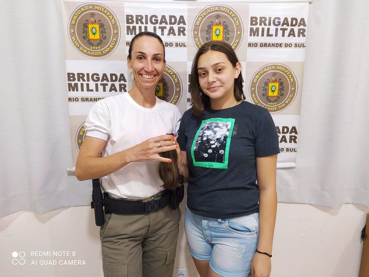 Faça você também como a Ágata Cristina Mower Viana, que compareceu no 3° Pelotão da Brigada Militar de Tenente Portela, e fez a entrega de suas mechas para a Soldado Janine Rohden Mainardi.