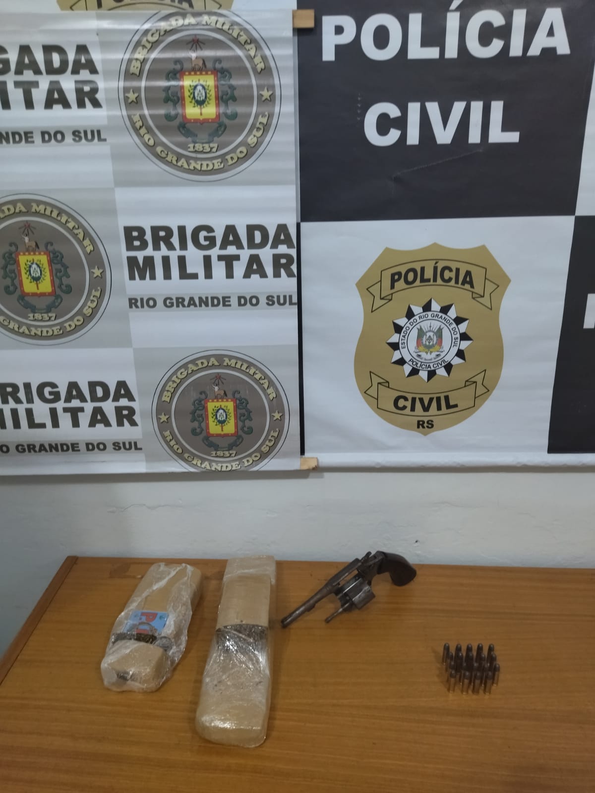 Realizada a abordagem do veículo, ocupado por três indivíduos, no KM 42 da RS 472, em Tenente Portela, os policiais localizaram uma arma de fogo (revólver calibre .32), na cintura de um dos ocupantes do veículo. Ainda, foram localizadas munições e uma mochila contendo e aproximadamente 1,5 kg de maconha.