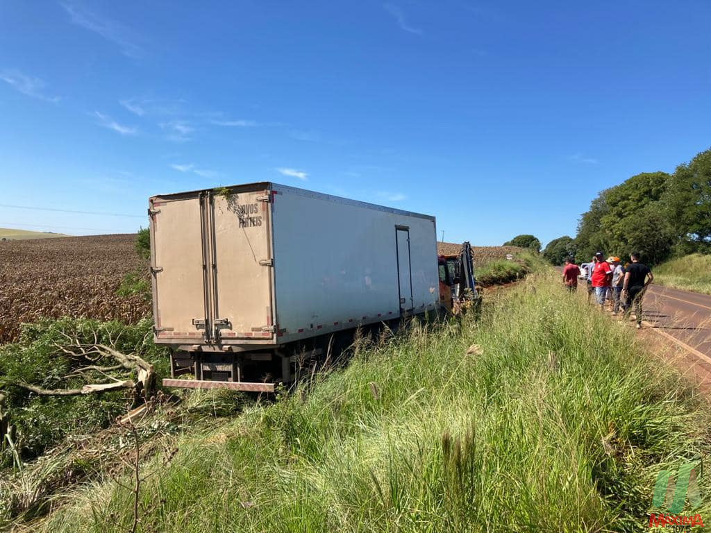 O caminhão foi removido na manhã deste sábado, com ajuda de uma retroescavadeira da Secretaria de Obras de Ronda Alta.