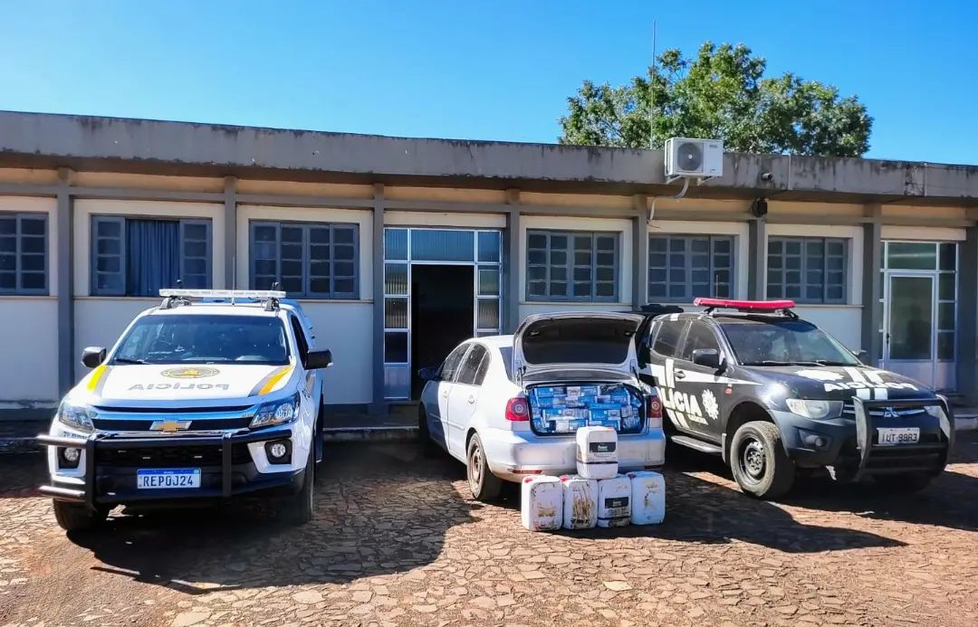 Neste sábado (01/04), policiais militares do 7º Batalhão de Polícia Militar (7ºBPM), juntamente com agentes da Polícia Civil, durante ações da Operação Hórus, após receber informações de que um veículo estaria deslocando da área da fronteira, possivelmente transportando ilícitos, realizaram diligências, sendo localizado o veículo VW/Polo em uma propriedade rural, no seu interior foram encontrados 05 galões de agrotóxicos e 12.440 maços de cigarros de origem estrangeira.