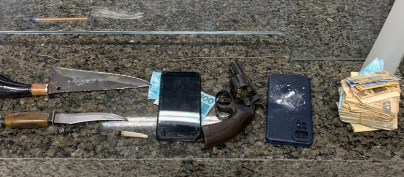 Ao realizar busca no banheiro para onde o suspeito de 36 anos tinha ido, os policiais encontraram, em uma gaveta da pia, um revólver calibre 32 da marca Rossi, contendo quatro munições intactas. Além disso, durante revista no veículo do acusado, foram encontrados um cigarro com substâncias com características de maconha, resíduos de cocaína, duas facas, um celular e R$ 200,00 em dinheiro.