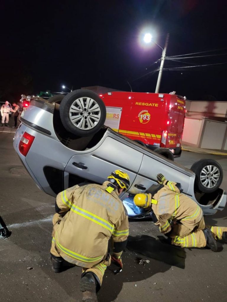 Veículo capota após bater em carro estacionado, em Santo Ângelo