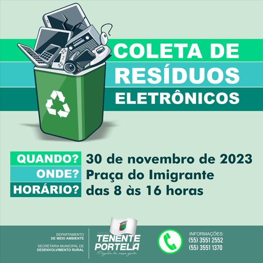 A Secretaria Municipal de Desenvolvimento Rural, através do Departamento de Meio Ambiente, programou para o dia 30 de novembro a próxima coleta seletiva de resíduos eletrônicos, em Tenente Portela. O local será a Praça do Imigrante, das 8 às 16 horas. Está será a última coleta deste ano.
