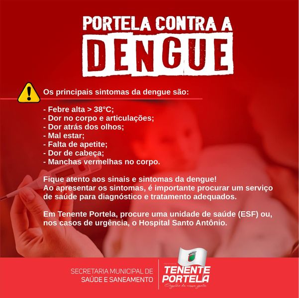 Tenente Portela fechou a semana passada com nove casos confirmados de dengue. Destes, um paciente foi internado e os outros sete realizam tratamento domiciliar. Um dos casos já foi considerado curado. Este dado fez com que a 2ª Coordenadoria Regional de Saúde e a Secretaria Municipal de Saúde e Saneamento decidissem intensificar o combate ao mosquito transmissor da dengue (aedes aegypti) e reforçar as orientações para a população.