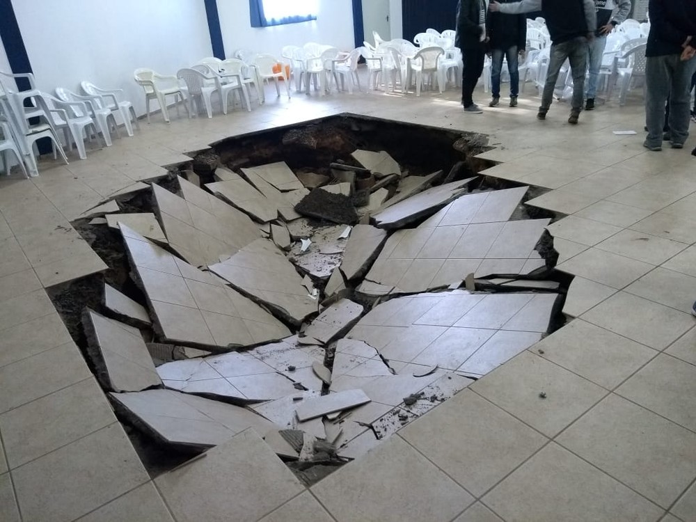 Um vídeo de uma câmera de segurança mostra o exato momento em que o piso de um auditório cede, abrindo um buraco no chão, durante uma apresentação em uma escola de Sobradinho, na Região Central do Rio Grande do Sul. O fato aconteceu na manhã desta quinta-feira (18) na Escola Estadual de Educação Básica Padre Benjamim Copetti.