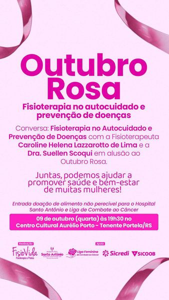 Hoje as 19h30 haverá no Centro Cultural Aurélio Porto de Tenente Portela, um evento com o tema: Fisioterapia no auto cuidado e prevenção de doenças, com a presença da fisioterapeuta Caroline Helena Lazzarotto e com a Dra. Suellen Scoqui.