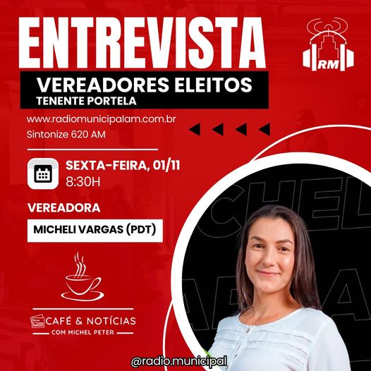 Para começar, na próxima sexta-feira, será entrevistada a vereadora eleita Micheli Vargas (PDT), que foi a mais votada com 687 votos. A entrevista será às 8h30min, no programa Café & Notícias, apresentado por Michel Peter.