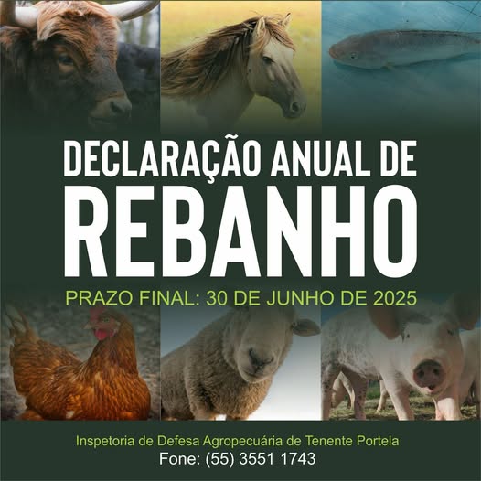 A Inspetoria Veterinária de Tenente Portela comunica aos produtores e proprietários de animais bovinos, aves, suínos, ovinos, equinos e peixes, que o CADASTRO ANUAL teve seu início nesta terça-feira, 01 de abril e se estenderá até o dia 30 de junho de 2025.