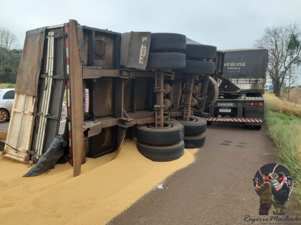 O condutor do caminhão tentou ao máximo desviar do veículo de passeio, fazendo com que o cavalinho saísse da pista mas mesmo assim atingiu o veículo de passeio, após o choque retornou a pista, mas como a carga de farelo de soja a granel, fez com que balançasse o segunda carreta, vindo a tombar no meio da pista.