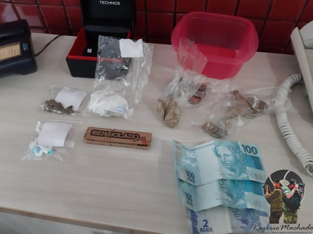 Os policiais desconfiados foram averiguar o que continha nessas caixa, foram encontradas 40g de cocaina e algumas gramas de maconha, buchas prontas par comercializar, dinheiro e maço de papel colomi , muito usado para enrolar os cigarros de maconha.F.L. 19 anos, após depoimento foi conduzida ao PESAR.