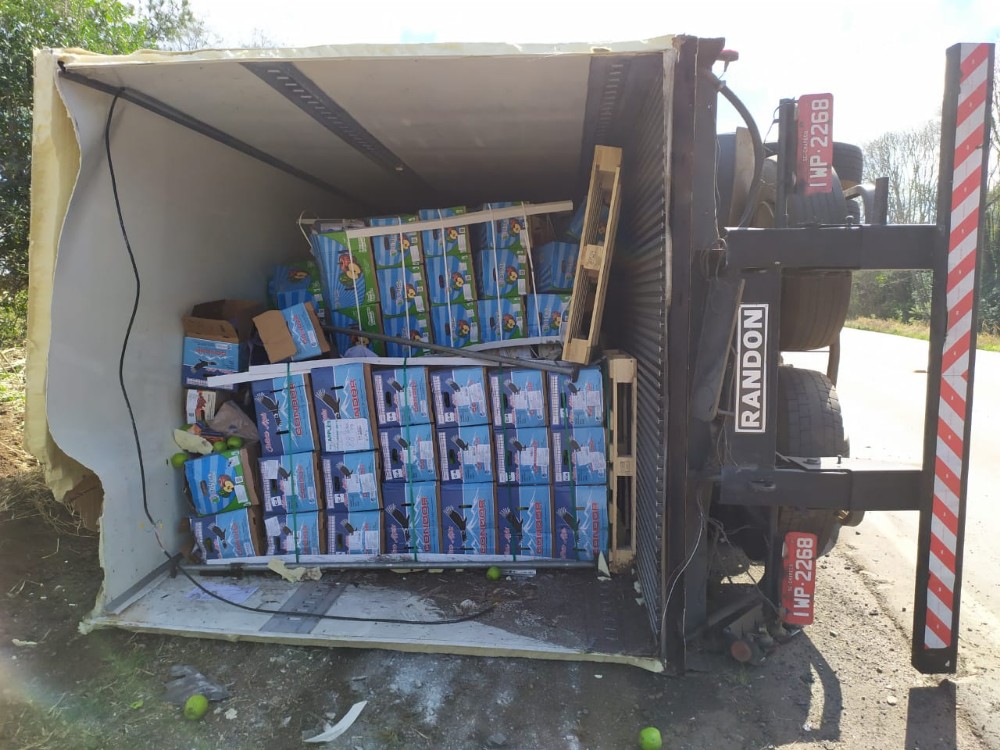Carreta carregada de maçãs tomba na ERS 404 em Rondinha